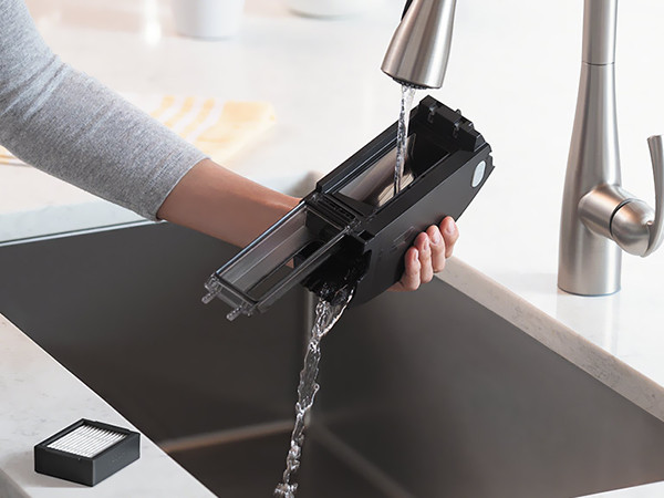 Инновационный. В новом Roomba e5 мотор вынесен за пределы мусоросборника. Теперь вы можете не только вытряхивать мусор из контейнера, его можно мыть водой.