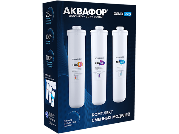 ● В комплект входит комбинация из трех сменных модулей Pro 1, Pro 50 и Pro Mg для обратноосмотической системы Аквафор Osmo Pro 50.